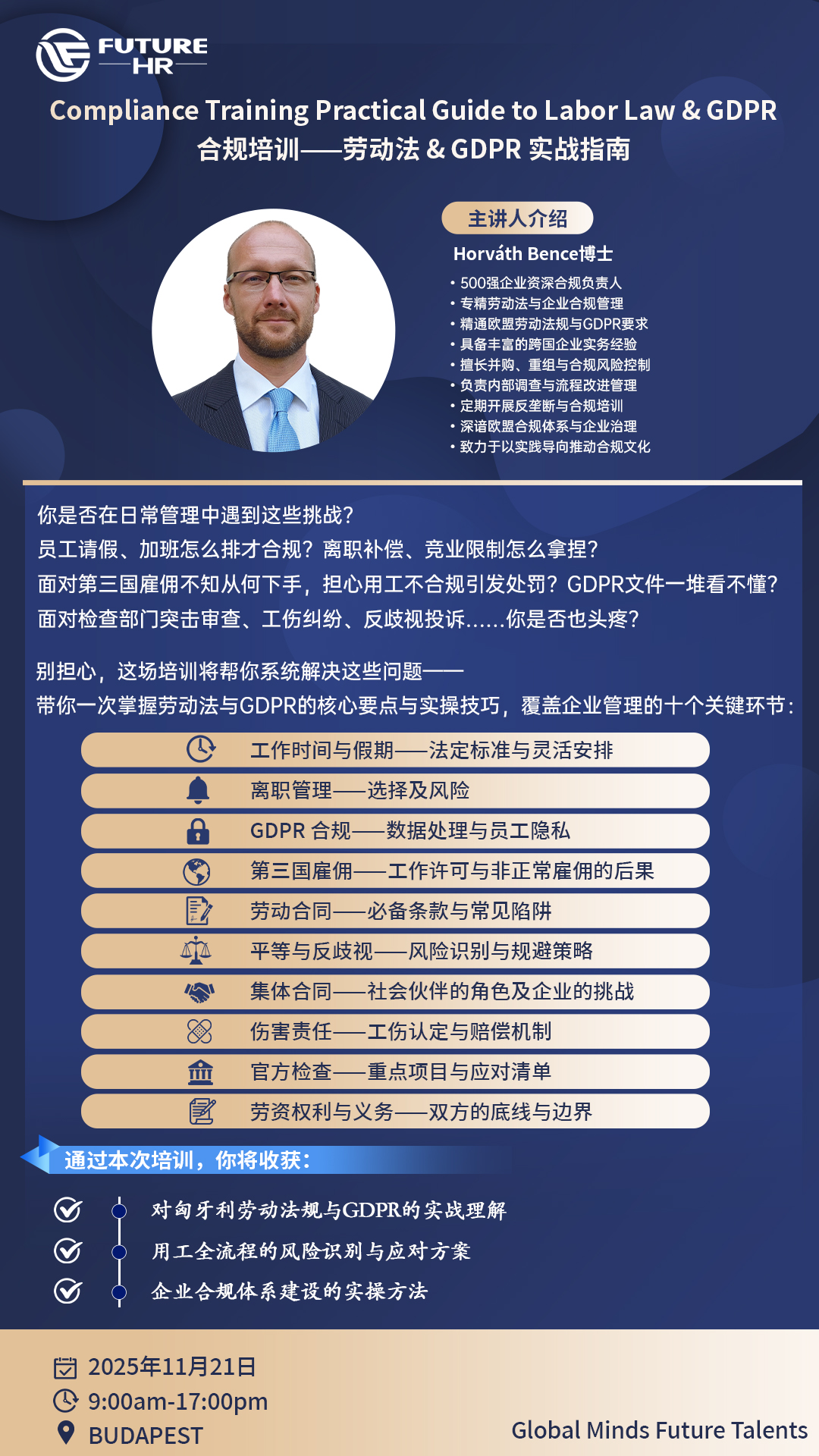 为了帮助 HR 更全面地理解法规、提升实践能力、减少企业风险,FUTURE HR 特别组织本次 【匈牙利劳动法 × GDPR 实战指南】专题培训,带您从实操角度系统掌握匈牙利合规要求。
